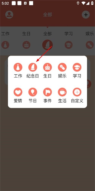 2、在分类选择菜单中点击纪念日选项,进入纪念日编辑页面。