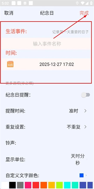 3、在纪念日编辑页面填写信息后,点击右上角的完成按钮保存该纪念日。