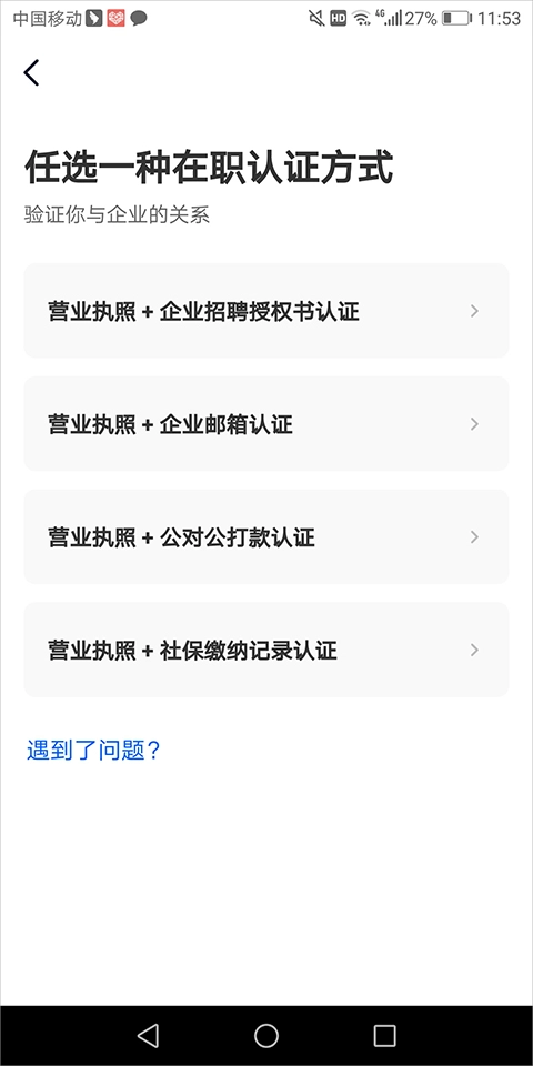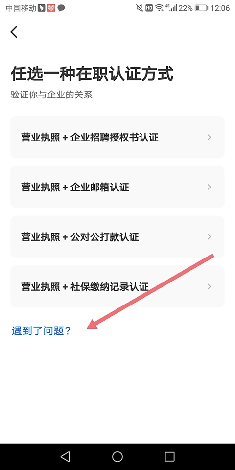 2)个人或其它特殊企业也可以在平台上完成在职认证后进行职位发布,其在认证方式页面中点击底部【遇到了问题】(下图红色箭头所指)