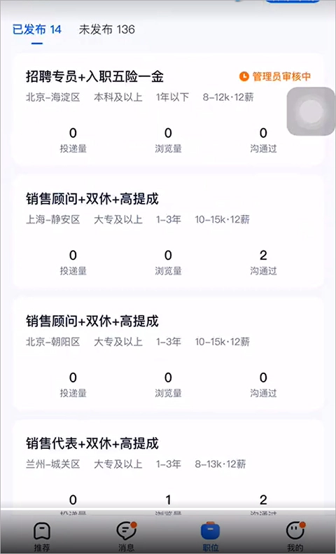 6、在打开的新页面中可以对职位审核状态进行查看,也可查看到已审核的职位的简历投递数量等信息