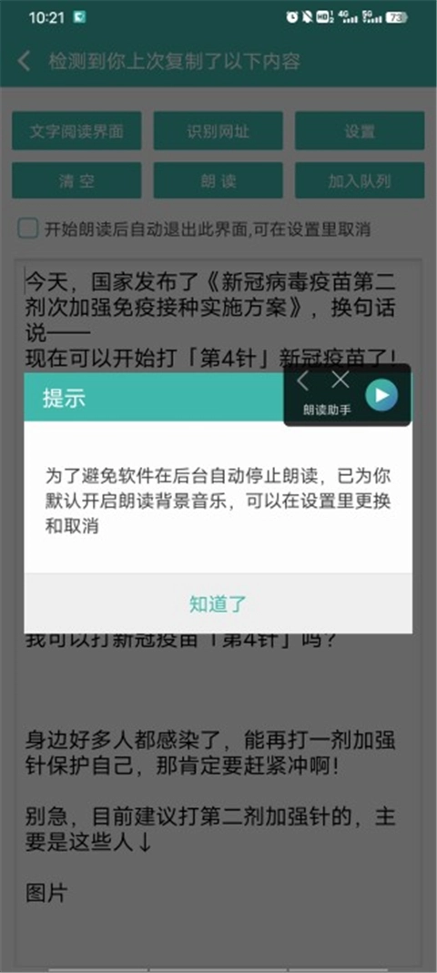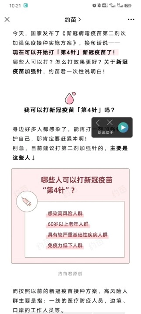 6、接着我们打开其他软件或公众号(比如约苗公众号),先把需要朗读的文字或网址复制下来,再点击朗读悬浮控件右侧的朗读按钮,就能唤起本软件;
