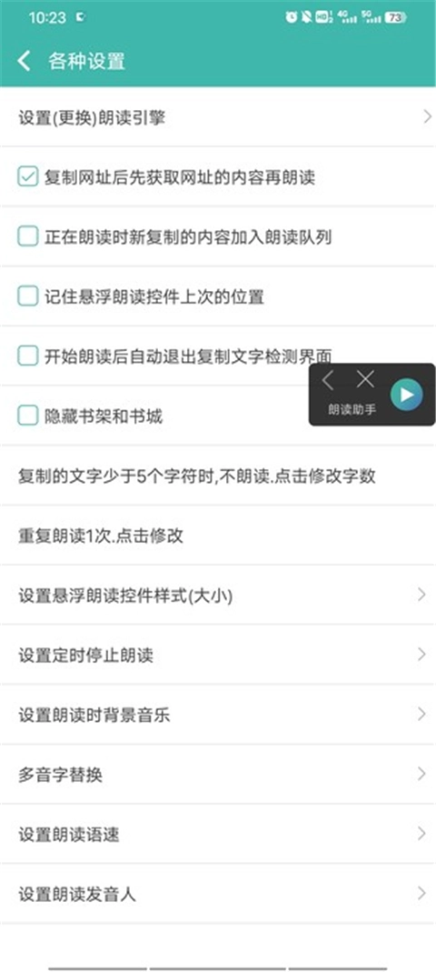 8、你能够在软件首页的设置选项中调整各类参数,像重复朗读的次数、朗读时的背景音乐、添加至朗读队列等功能都可以在这里设置。