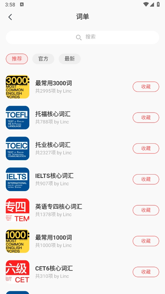 在“词单”可以浏览选择需要的备考的单词词汇。
