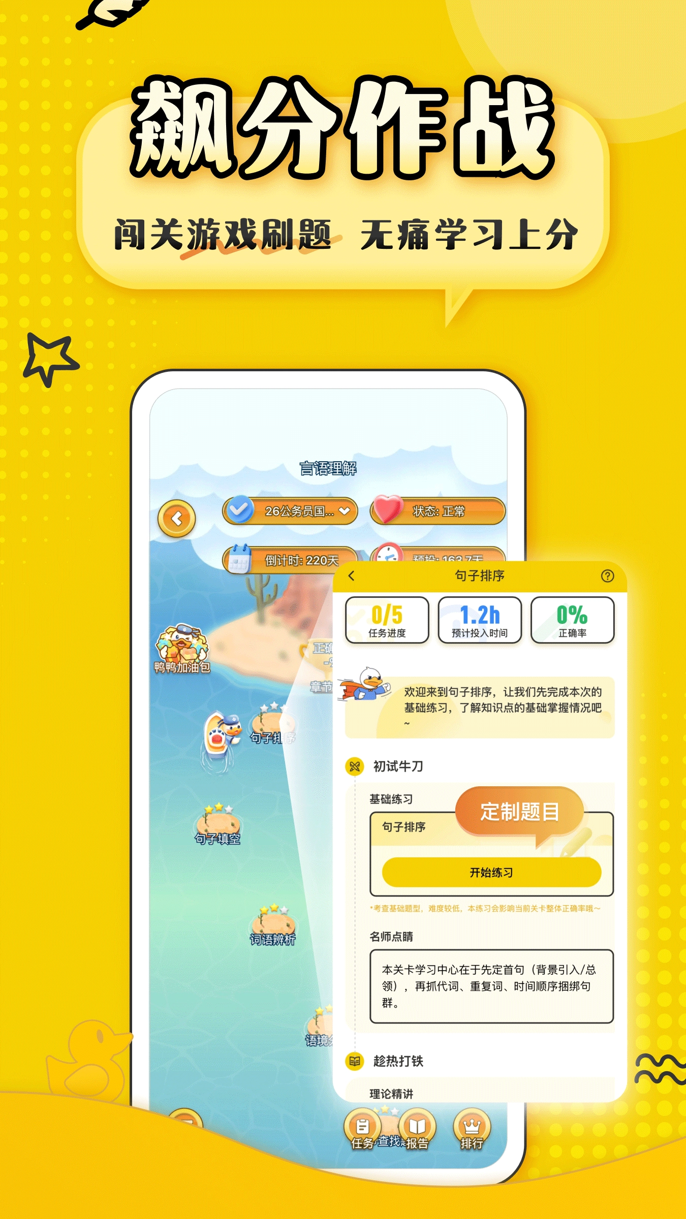 上岸鸭公考是一款专注于公职教育的在线学习平台,致力于为广大学员提供全面的招录考试培训服务。该平台覆盖公务员、事业单位、教资教招、军队文职、央国企、银行和社工等多个领域的考试,助力学员高效备考。上岸鸭拥有一支超千人的教学研发团队,深入钻研各地区的特色考情与命题趋势,力求为学员带来最优质的学习体验。选择上岸鸭,就等于选择了一个能与您共同成长的学习伙伴。无论是教学内容还是服务质量,平台始终坚守初心,聚焦学员的学习需求与成长。