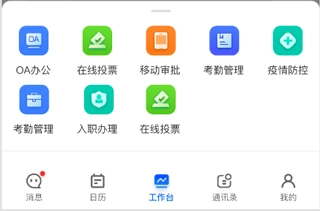 首页为工作人员提供统一的工作界面,根据当前用户权限显示不同的应用,不同类型的用户具备不同应用的权限。首页支持应用搜索功能、支持组织、个人等多种类型的工作台。同时待办、日程、通知公告等消息也可在首页查看。如果个人存在多个工作台【如果存在兼职,则会有多个工作台组织】,点击右上角进行切换。