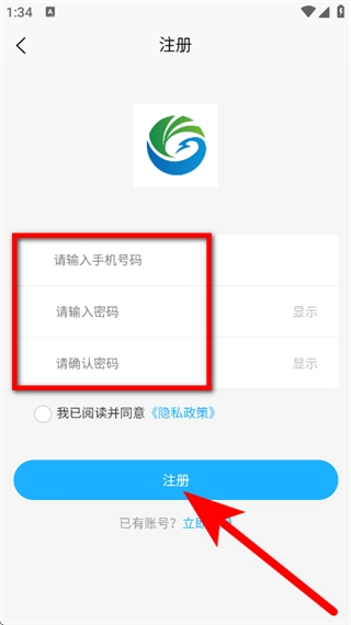 4、进入注册页面后,填写手机号码并设置密码,勾选相关选项,再点击注册按钮,即可完成账号注册。