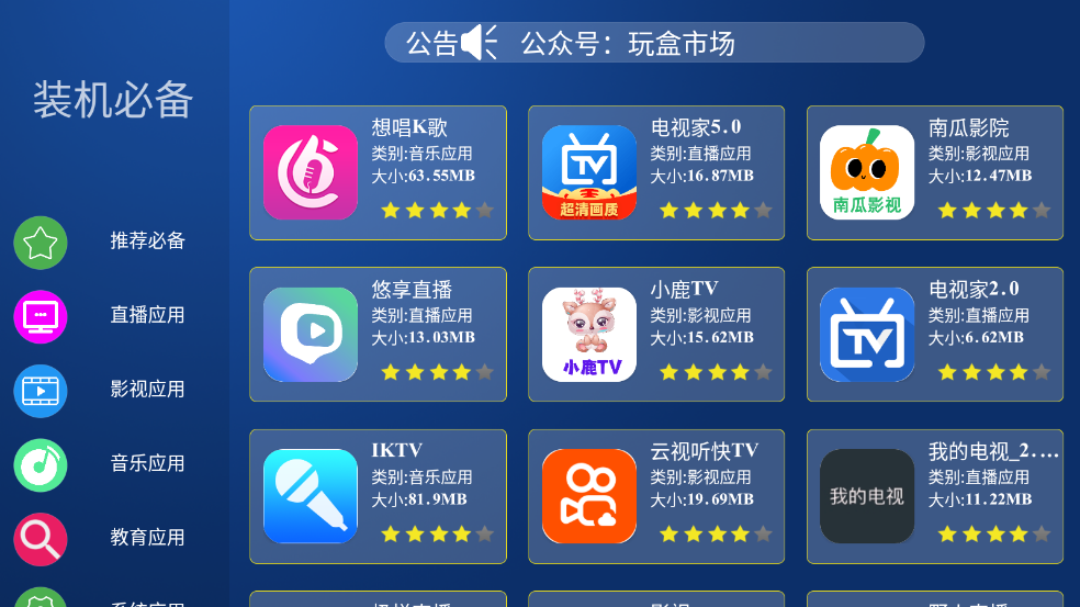 玩盒市场电视版这款软件,整合了大量优质电视应用资源,涵盖学习、影视、音乐等多个类别,所有应用均为当前最新且热门的资源。它具备超细致的分类功能,能让用户更便捷地找到所需资源,同时还在持续进行更新与优化,确保用户每次使用时都能获取到最新内容。