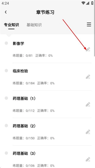 2、在章节练习页面,点击目标章节旁的练习按钮,可进入该章节的答题页面。