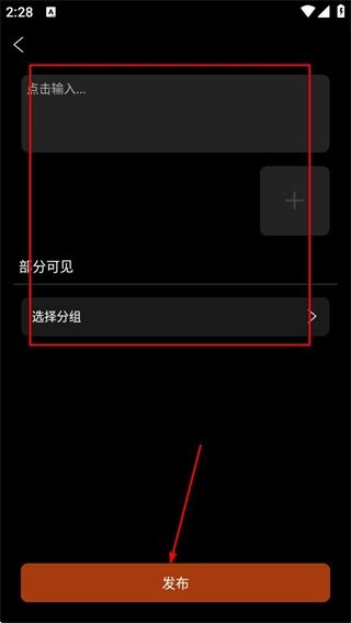 3、在动态页面,填写内容并设置分组后,点击发布按钮即可发布动态。