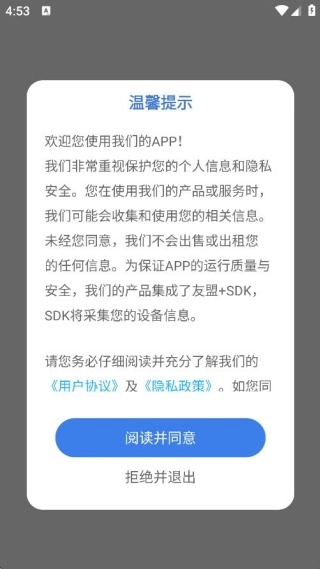 1. 首次使用时需要查看用户协议和隐私服务,点击同意才可以继续。