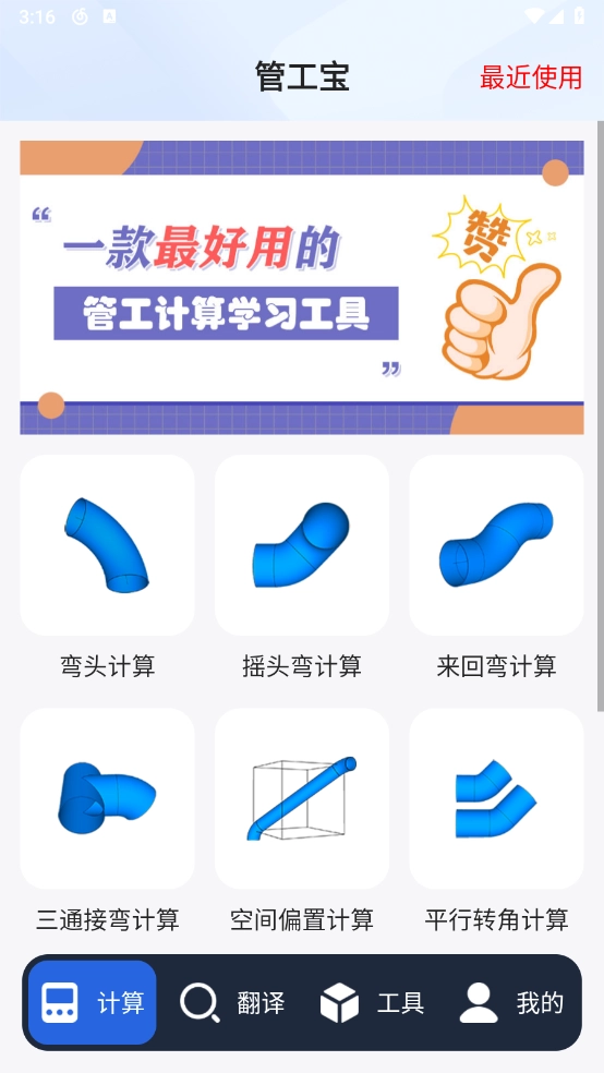 进入软件后,“计算”板块整合了弯头计算、摇头弯计算、空间偏置计算等多种计算功能模块。
