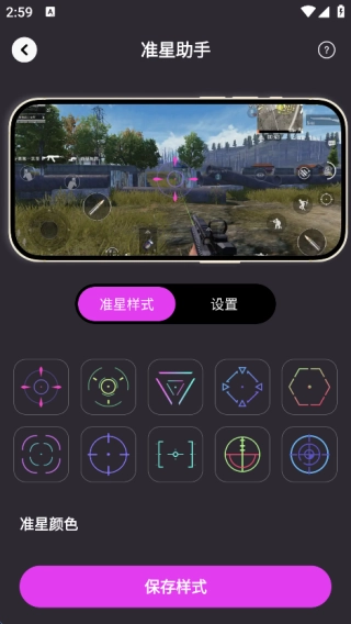 3、点击辅助准星进入到准星助手页面中,选择准星的样式,然后进行保存;