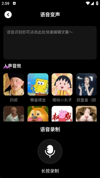 4、点击语音变声的功能,输入语音识别,然后进行识别编辑文案,同时选择人声音效进行录制。