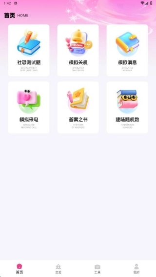 1、安装,进入首页,带来了社恐测试题、模拟来电、答案之书等功能。