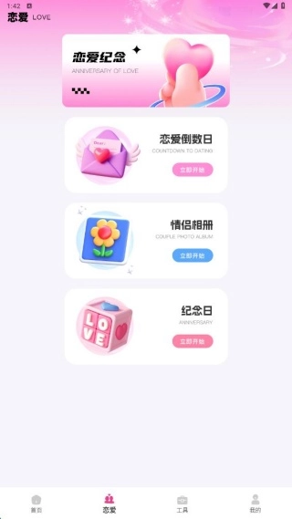 2、在恋爱页面,支持倒数日、纪念日、情侣相册等功能。