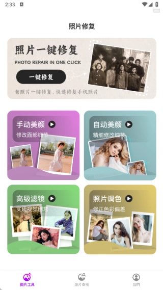 1、在图片工具中有图片一键修复、手动美颜、自动美颜、高级滤镜、照片调色等功能;