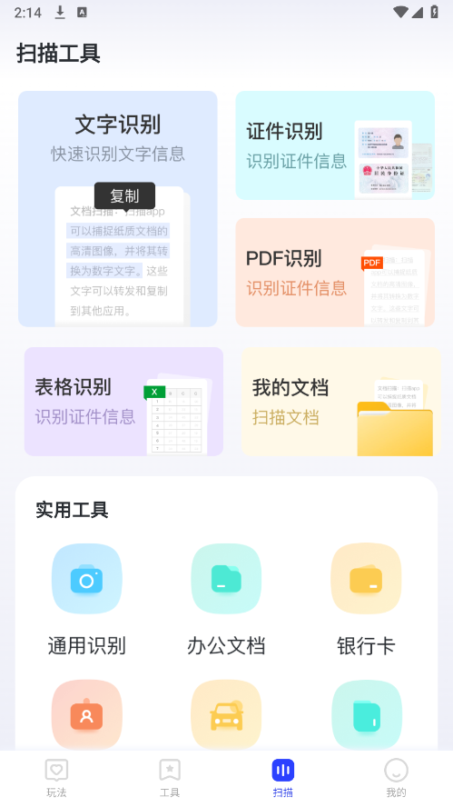 在扫描板块,包含证件扫描、文字扫描和表格扫描等功能,直接打开即可使用。