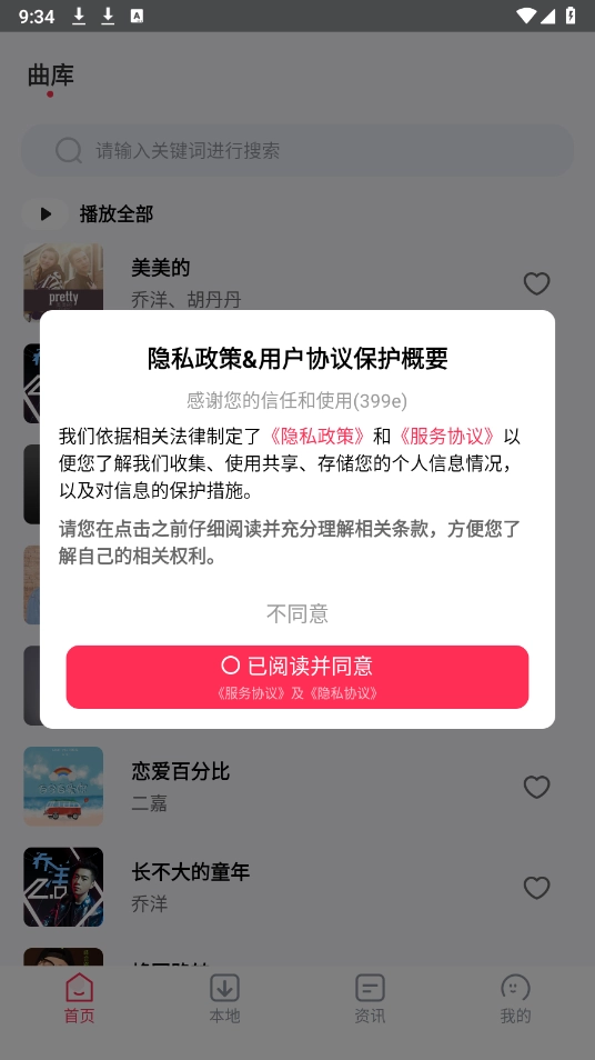 安装动听免费音乐,同意相关的政策与协议之后打开。