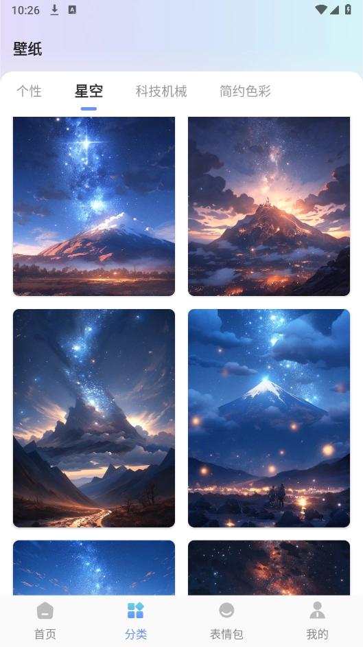 在“分类”板块,聚集了海量不同类型的壁纸资源,像个性、星空和科技机械等都包含在内。
