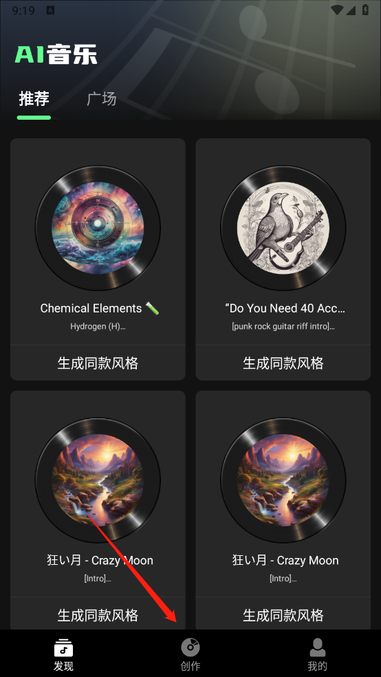 打开软件后,进入“创作”页面,你可以看到“灵感创作”和“自定义创作”两个选项供选择。