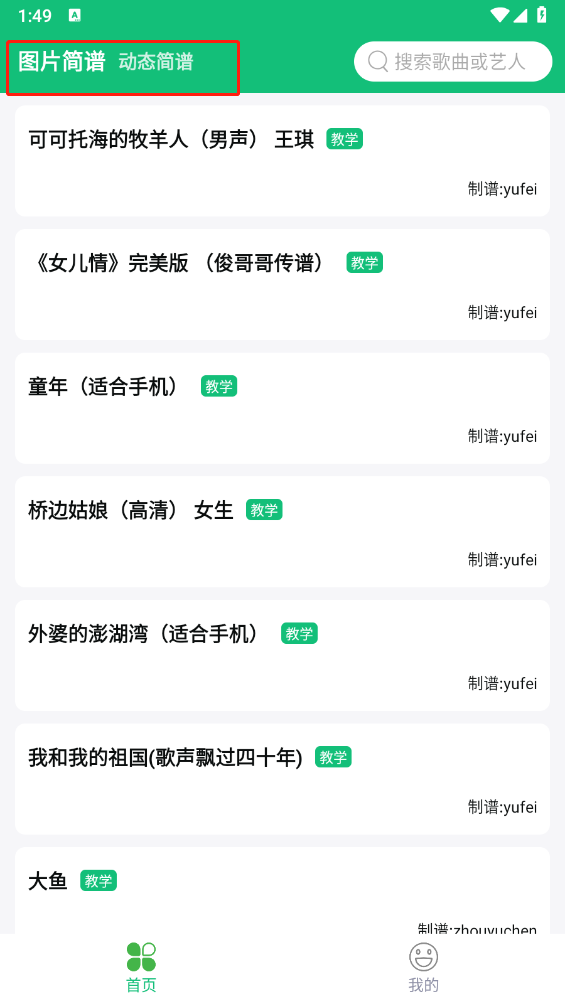 打开软件后,在首页能够选择图片简谱和动态简谱两种类型。其中,图片简谱的呈现形式为上下滚动,而动态简谱则会自动跳转到每一个音符所在的位置。