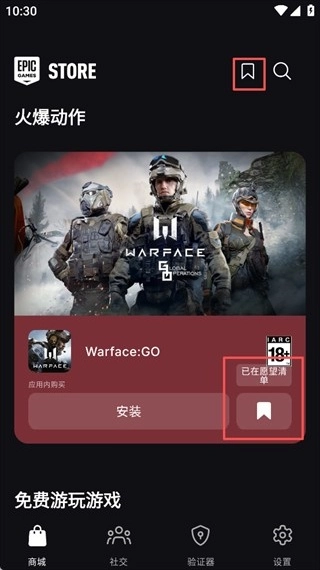 2.在“安装”按钮旁边点击收藏图标,当页面出现“已在愿望清单”提示时即操作成功。