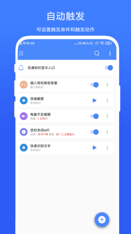 它不仅能自动触发各类操作,增强用户使用的便捷性与效率,还可当作一款高效工具来运用。用户能够依据自身需求灵活设定触发条件和对应的操作,使手机在符合条件时自动完成预先设置的动作。不管是定时开启飞行模式、插入耳机后自动调低音量,还是电量偏低时自动提醒用户,一键触发功能都能协助用户省去繁杂的操作步骤,带来更为便捷的使用感受。