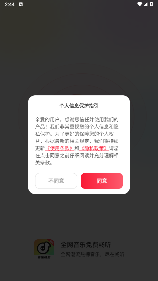 安装全网音乐免费畅听应用,在同意相关政策与协议后即可打开使用。
