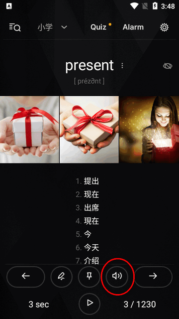 每个单词都有真人发音、翻译以及例句。