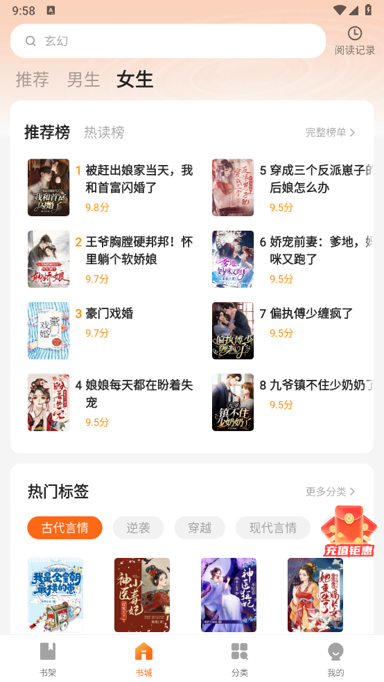 在书架、书城和分类板块里,有海量的小说资源,涵盖了言情、科幻和武侠等多种类型。