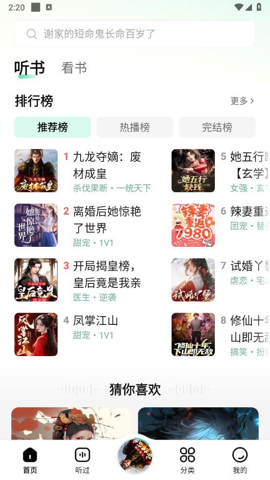 首页设有看书与听书两种模式,会为大家推荐当下热门的小说内容。