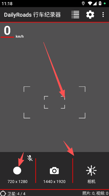 打开软件后,您会直接进入实时记录界面,屏幕最左侧的圆形图标显示卫星定位状态,中间的图标用于切换录像与拍照模式,您可拍摄行车视频或上传实时影像。