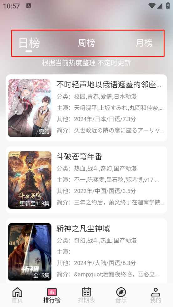 “排行榜”页面设有日榜、周榜与月榜,方便用户第一时间找到当下热门的动漫资源。