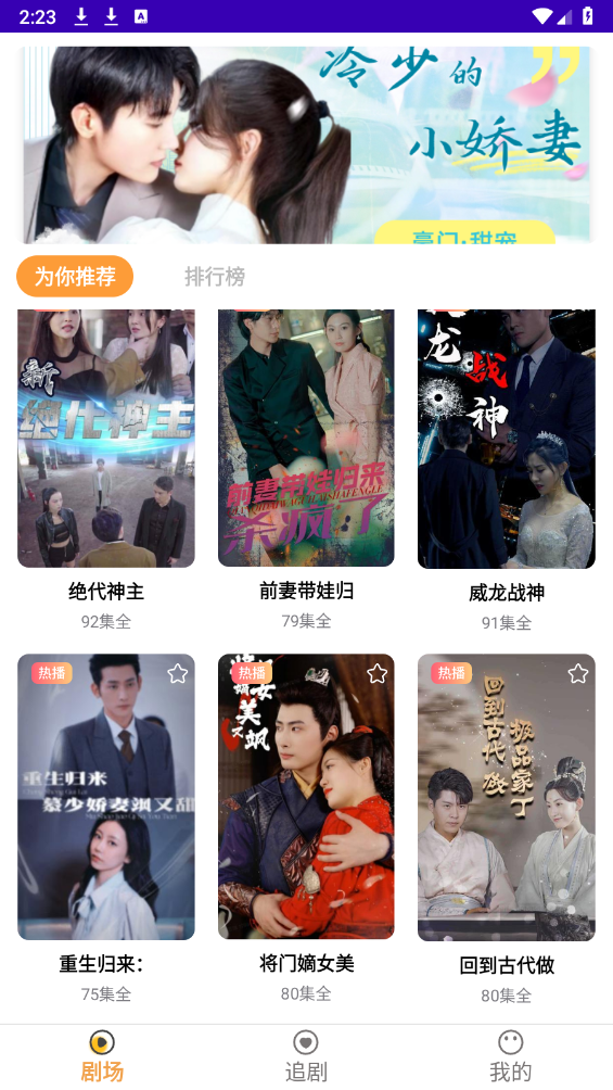 进入平台首页后,“剧场”栏目汇聚了丰富多样的短剧资源,涵盖爱情、古装、都市等多种题材类型。