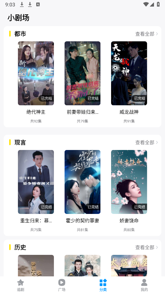 进入首页后,能看到丰富的短剧资源分类,涵盖都市、现言、历史等多种类型。