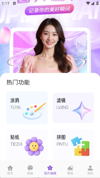 3、图片编辑页面包含涂鸦、滤镜、贴纸与拼图四大版块;