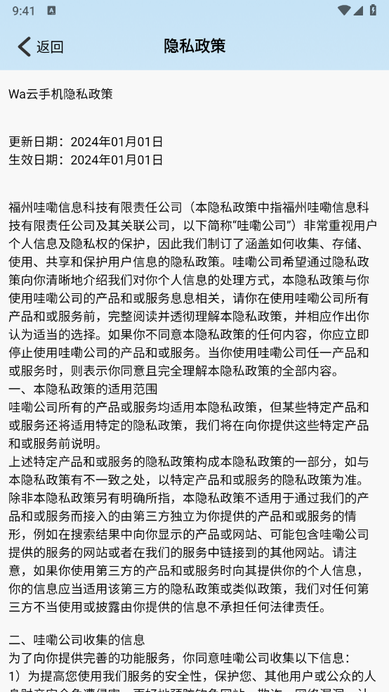 Wa云手机是福州哇嘞信息科技有限责任公司推出的云手机平台,支持一部手机同时登录多个账号,无论是游戏娱乐还是日常办公场景都能适用;它可生成多个独立运行的操作空间,使用过程中不会消耗本地流量,也不会导致手机出现卡顿问题。