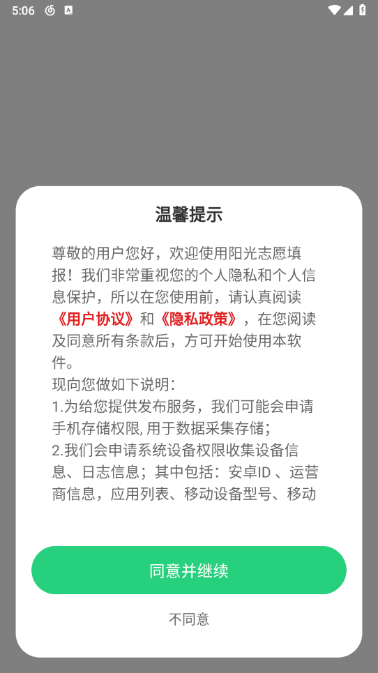 安装阳光志愿填报,同意相关的政策与协议。