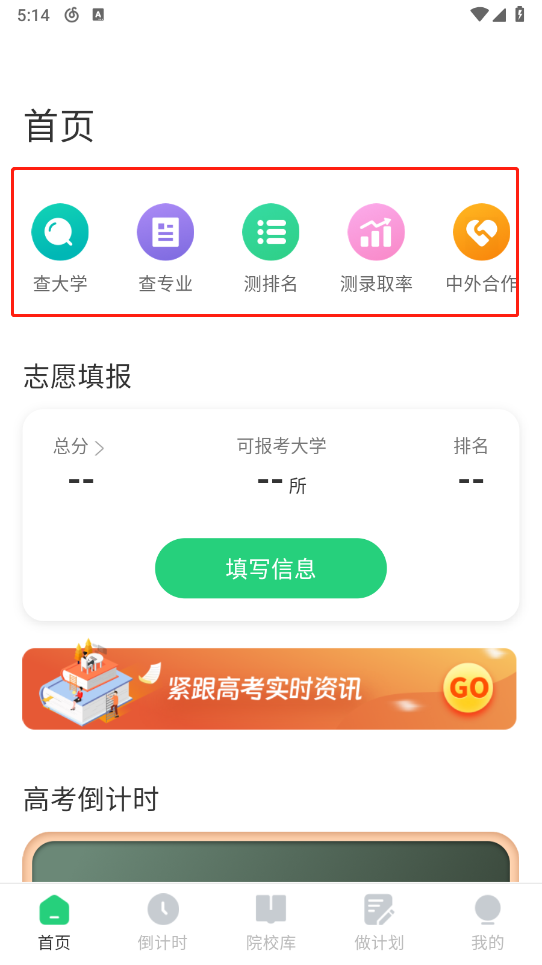 在首页能够查询大学、专业相关信息,还可以测算录取率以及查看各类排名。