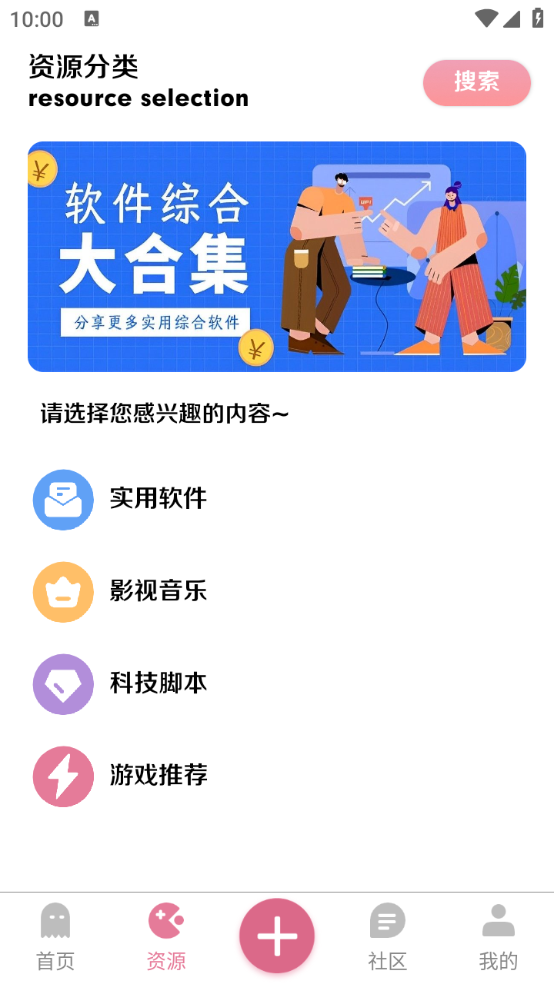 资源板块对软件进行了细致分类,涵盖影视、游戏和实用软件等类别。