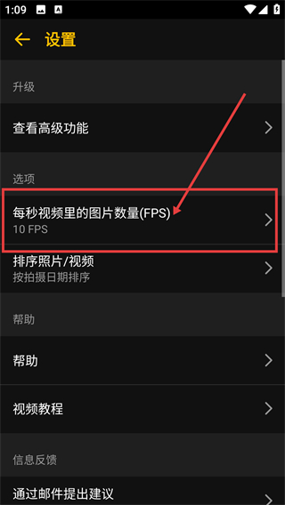 2、进入设置页后点击【每秒视频里的图片数量(FPS)】选项,就能打开帧率选择面板,调整视频的帧速率哦。