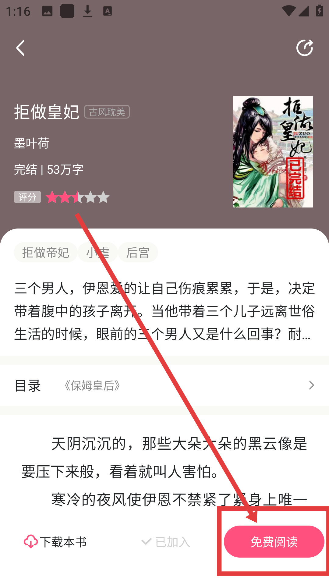 》是一款拥有海量阅读资源的小说阅读平台,带给你最佳的看书服务,清新简约的软件界面,超多精彩的小说书籍,各种不同的优质小说,在这里你都将能够随时随地的进行阅读。超多的优秀作品让你进行观看,不同题材的阅读作品,在这里你都能够进行阅读书籍。1、在《拒做皇妃》详情页点击【免费阅读】按钮,即可进入阅读页面开始看书啦。