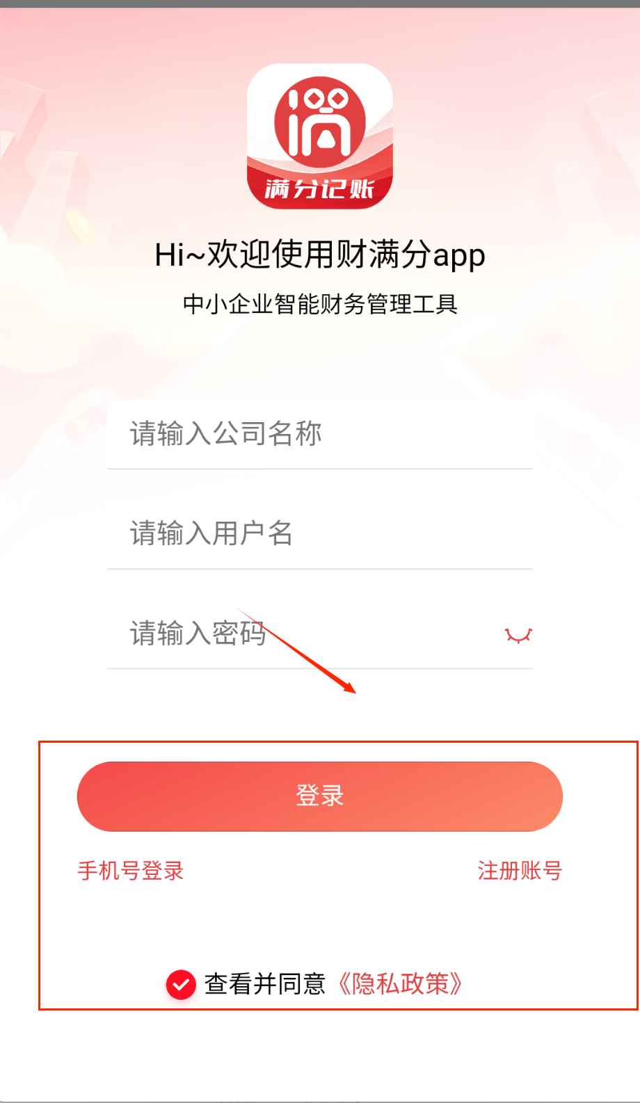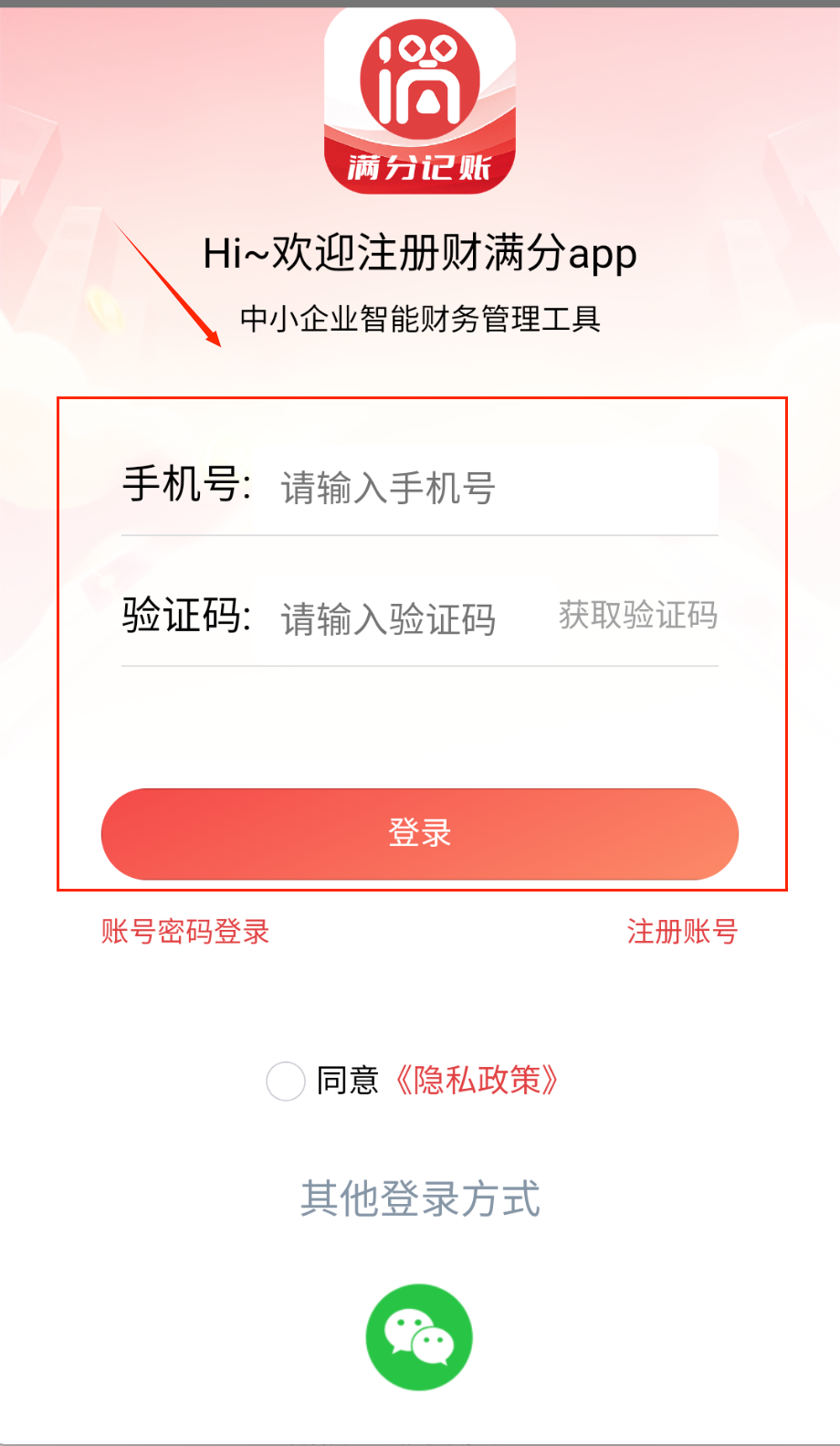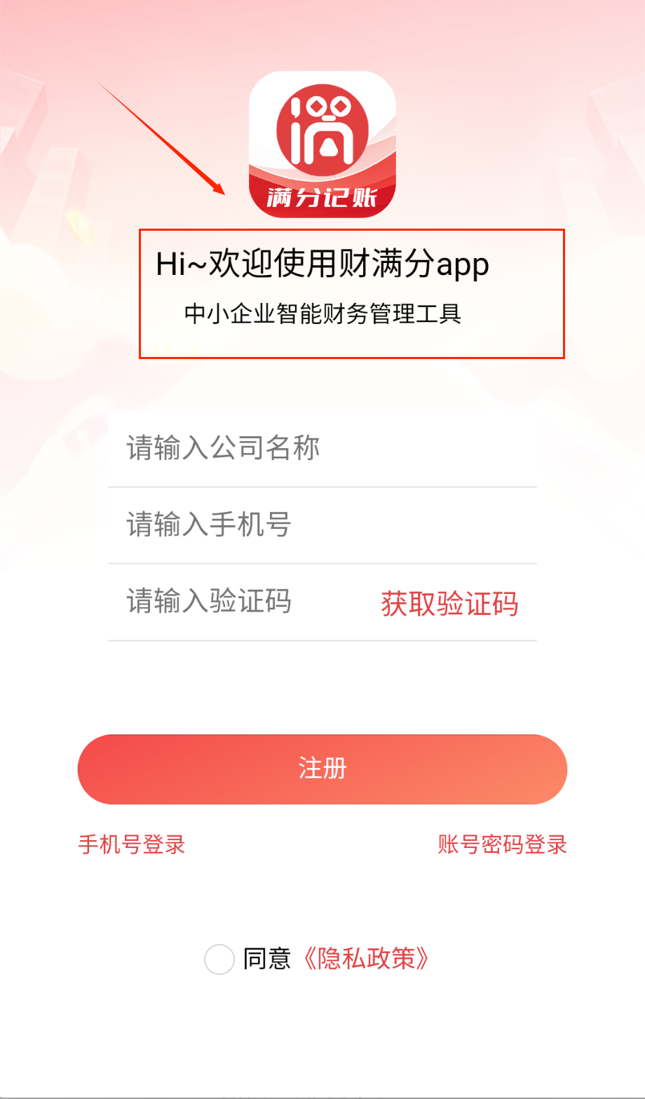 专为企业设计的智能财务工具,致力于优化财务流程和提升管理效率,通过数字化手段协助企业完成日常记账、预算控制、项目跟踪及收支分析,实现财务业务一体化协同管理,让复杂的数据变得清晰直观,为企业决策提供有力支持,从而推动稳健发展。打开财满分后,映入眼帘的便是粉色背景的登录界面,顶部配有红白配色的“满分记账”图标,界面中间则显示着“Hi~欢迎使用财满分”的问候语。