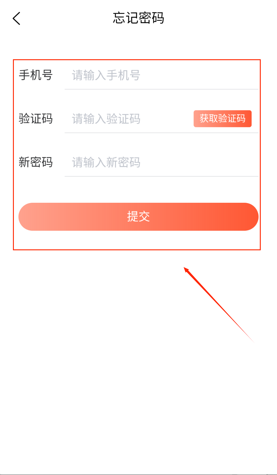 3、 在找回密码页面,顶部写着"忘记密码"四个字,先在"手机号"框输入你注册时用的号码,点旁边橙色的"获取验证码"按钮。