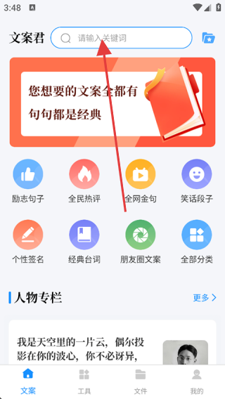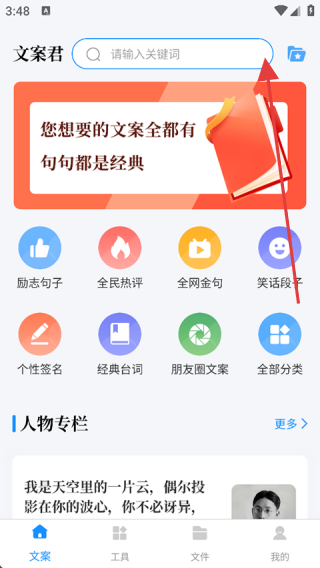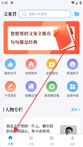 是整合海量优质文案与智能创作工具的多功能文字服务平台,旨在为用户解决文案创作难题,提供从素材获取到内容生成的全流程支持。它汇聚经典台词、励志金句、朋友圈爆款文案等多元内容,搭配语音转文字、图片识别、多语言翻译等实用工具,无论是社交动态发布、灵感收集,还是跨语言创作需求,都能在此找到高效解决方案,助力用户轻松驾驭文字表达,提升内容创作质量与效率。1、打开文案君,点击【首页】。