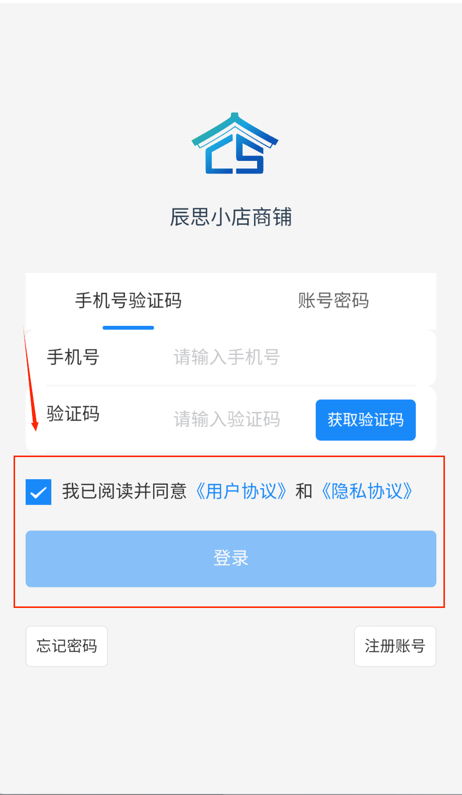 2、如果想用手机号登录就选验证码方式,输入手机号后点获取验证码,收到后填进去再勾选同意协议,点击登录按钮就能进入店铺管理页面啦。