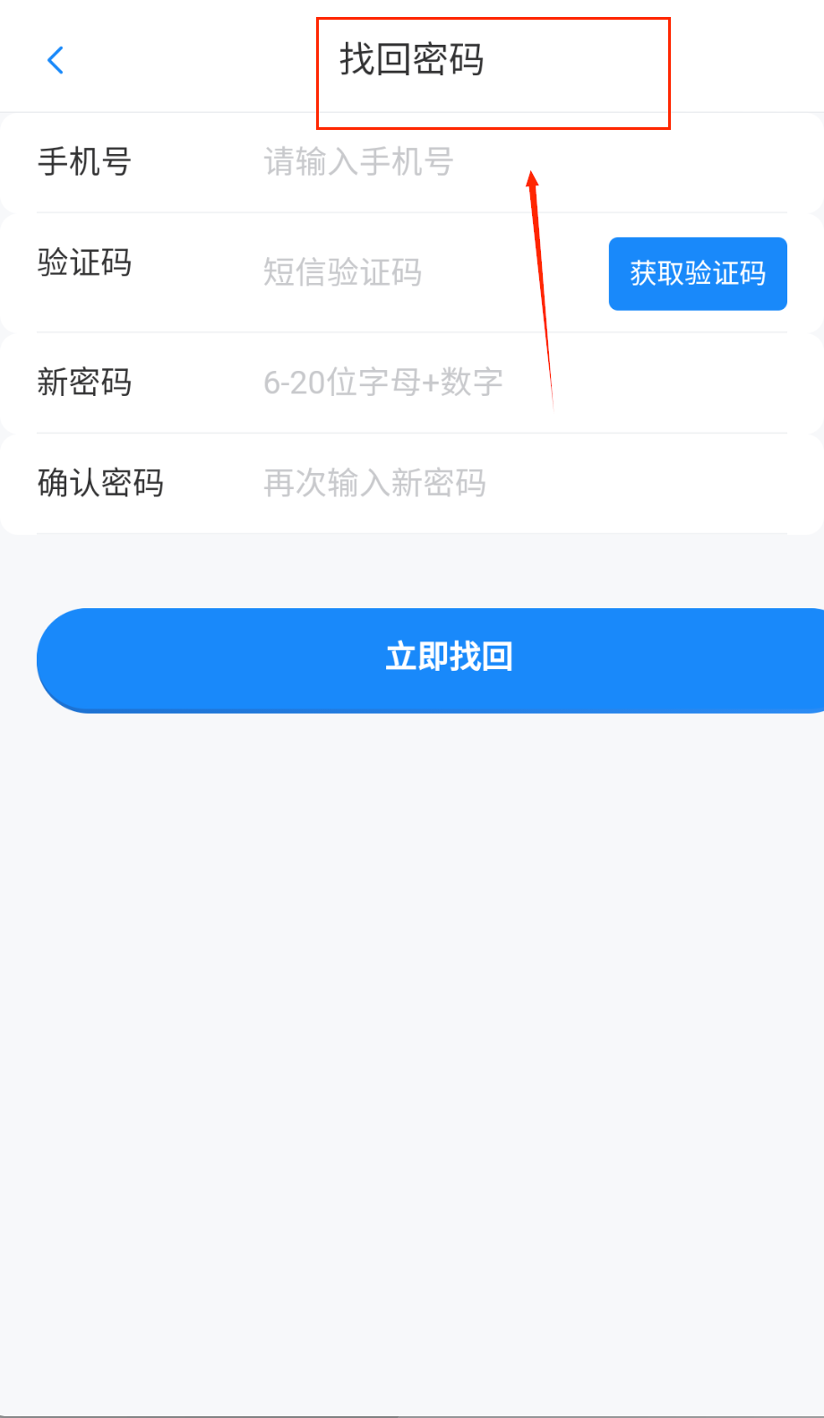 4、忘记密码时点找回密码功能,输入手机号获取验证码,设置6-20位字母加数字的新密码并确认,点击立即找回就可以用新密码登录啦。