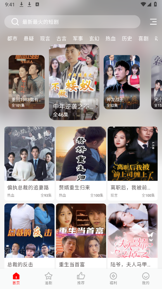 进入首页后,能看到丰富的短剧资源分类,涵盖悬疑、古言、热血等多种类型。