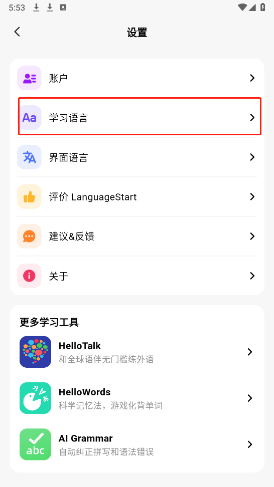 可以点击“设置”进行更换语言学习。
