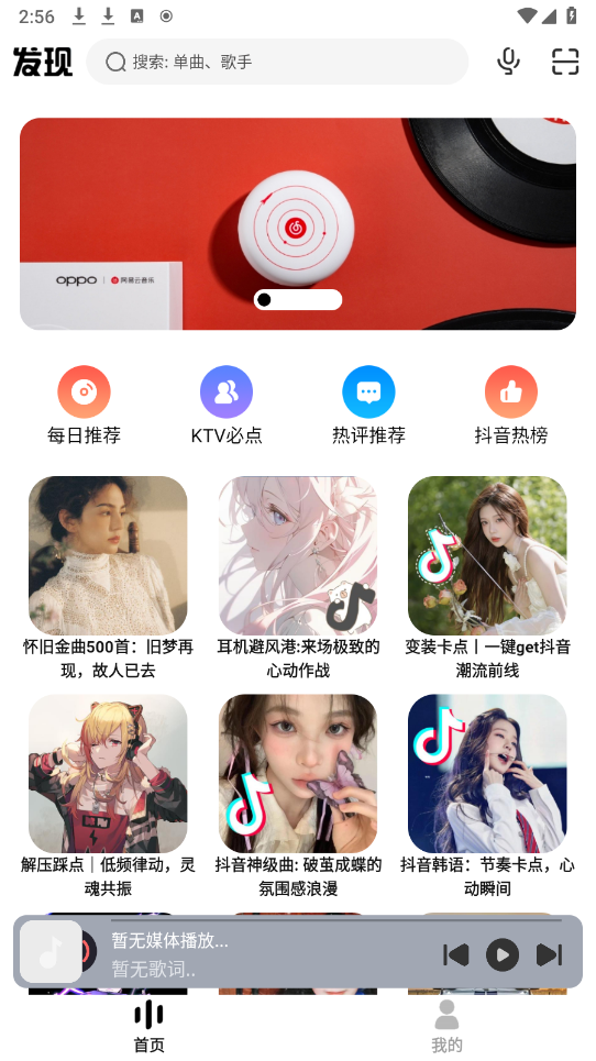 首页聚合了丰富多样的音乐类型,像每日推荐、KTV必点以及抖音热歌等各类内容应有尽有。